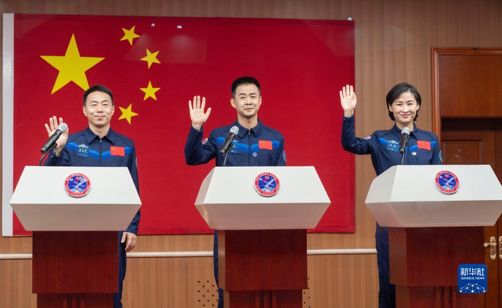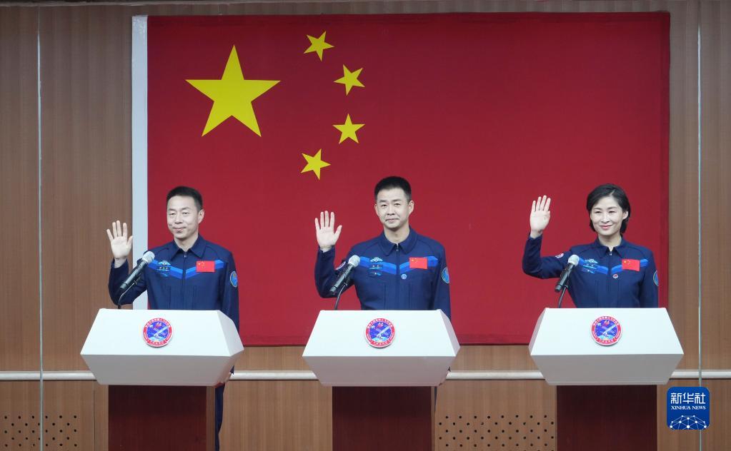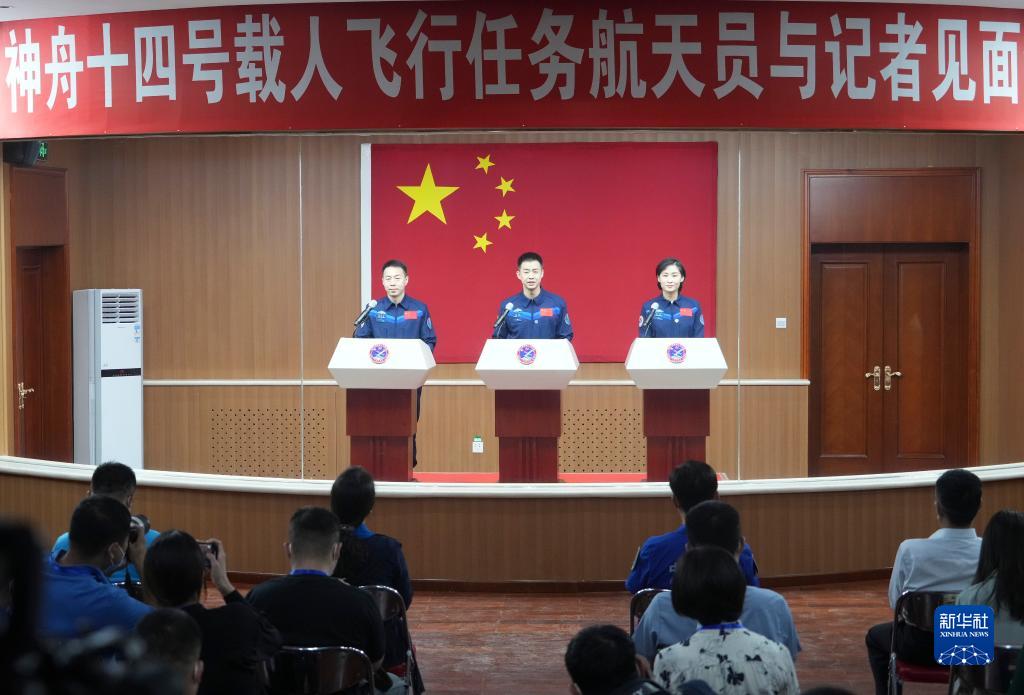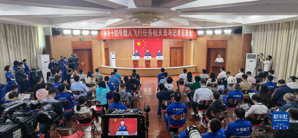 当日,执行神舟十四号载人飞行任务的3名乘组航天员陈冬、刘洋、蔡旭哲在酒泉卫星发射中心问天阁与媒体记者集体见面,并回答记者提问。