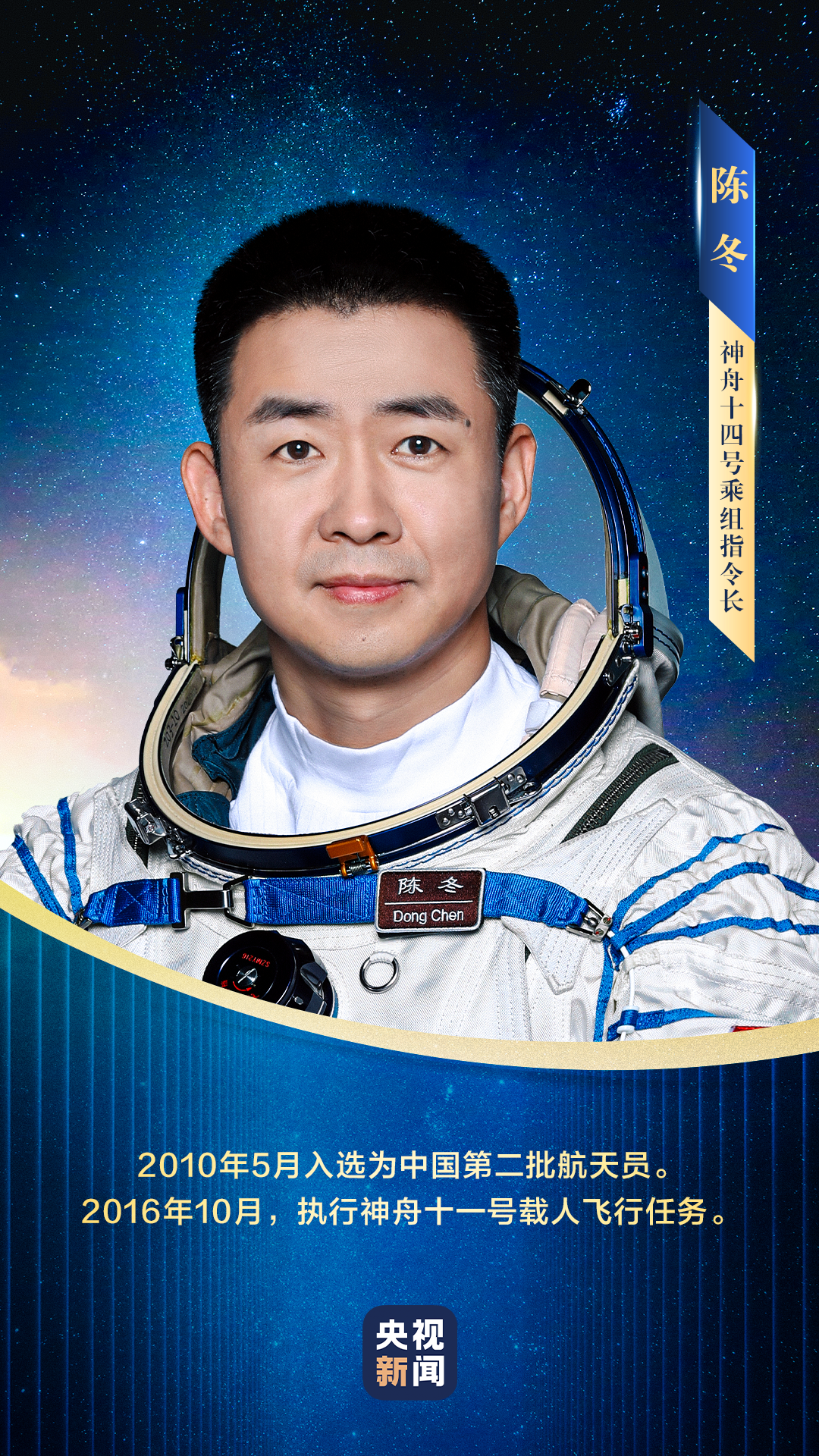 陈冬,男,汉族,籍贯河南郑州,河南洛阳出生,中共党员,硕士学位。1978年12月出生,1997年8月入伍,1999年4月加入中国共产党,现为中国人民解放军航天员大队一级航天员,大校军衔。曾任空军某师某团某飞行大队大队长,被评为空军一级飞行员。2010年5月入选为我国第二批航天员。2016年10月,执行神舟十一号载人飞行任务,同年12月,被中共中央、国务院、中央军委授予“英雄航天员”荣誉称号,并获“三级航天功勋奖章”。经全面考评,入选神舟十四号载人飞行任务乘组并担任指令长。