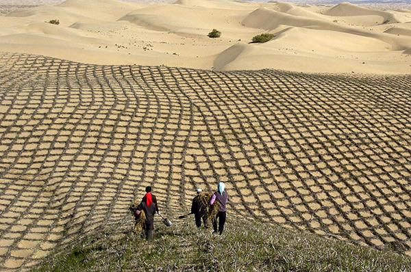 “麦草方格”固沙法曾蜚声世界,被誉为“中国魔方”,这仅仅是中国独创的治沙经验的一个缩影。修梯田、修坝地、修水库,植树造林防风沙,引水拉沙造良田;“穿靴、戴帽、贴封条、扎腰带”科学营林;“锁边固沙”“螺旋钻种植法”“节水容器种植法”……