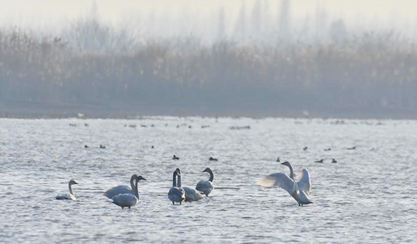 2021年1月13日在湖南省岳阳市东洞庭湖国家级自然保护区采桑湖拍摄的天鹅。(新华社发)