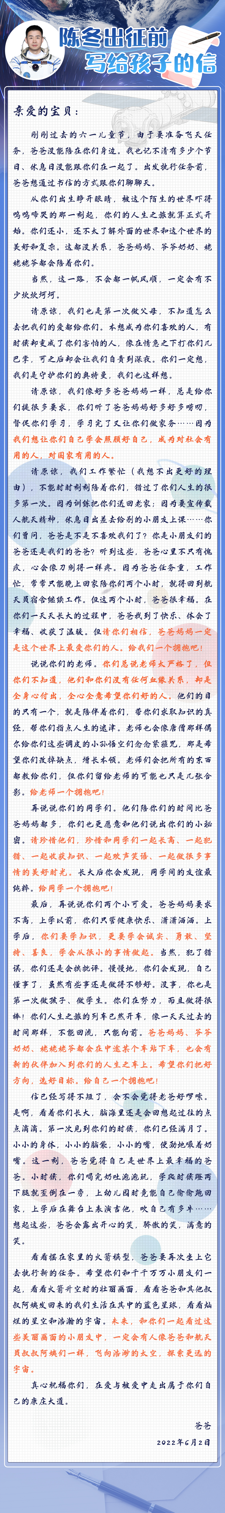 这是航天员陈冬写给自己孩子的一封信。信中没有华丽的词藻,却字字发自肺腑,流露出如山的父爱。信中也没有曲折起伏的故事情节,我们却能从字里行间看到一位父亲的言传身教。