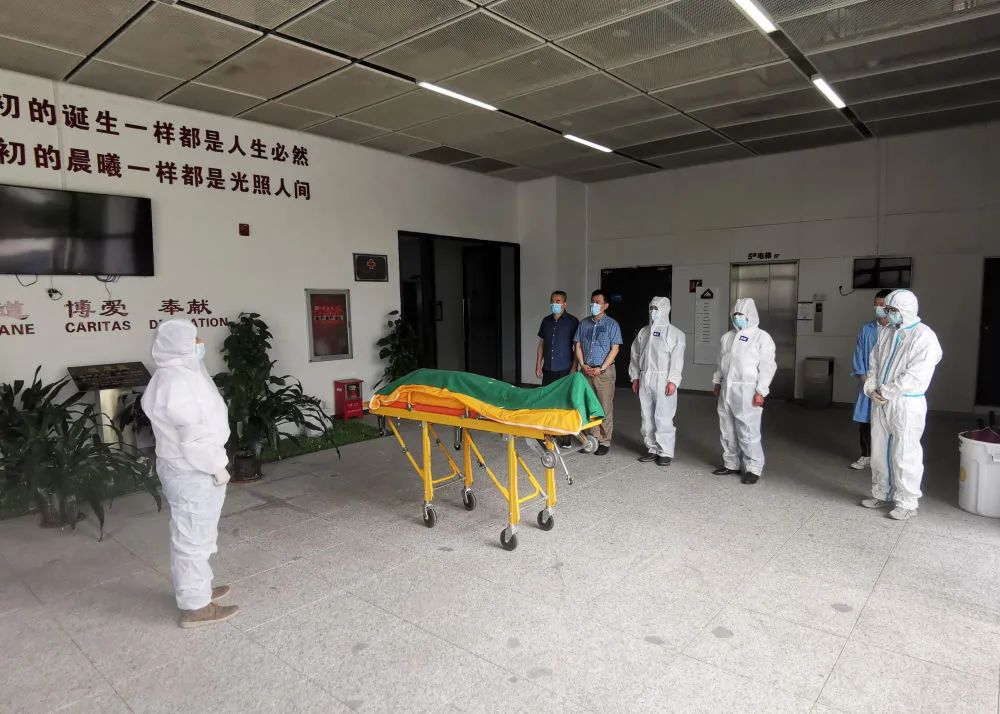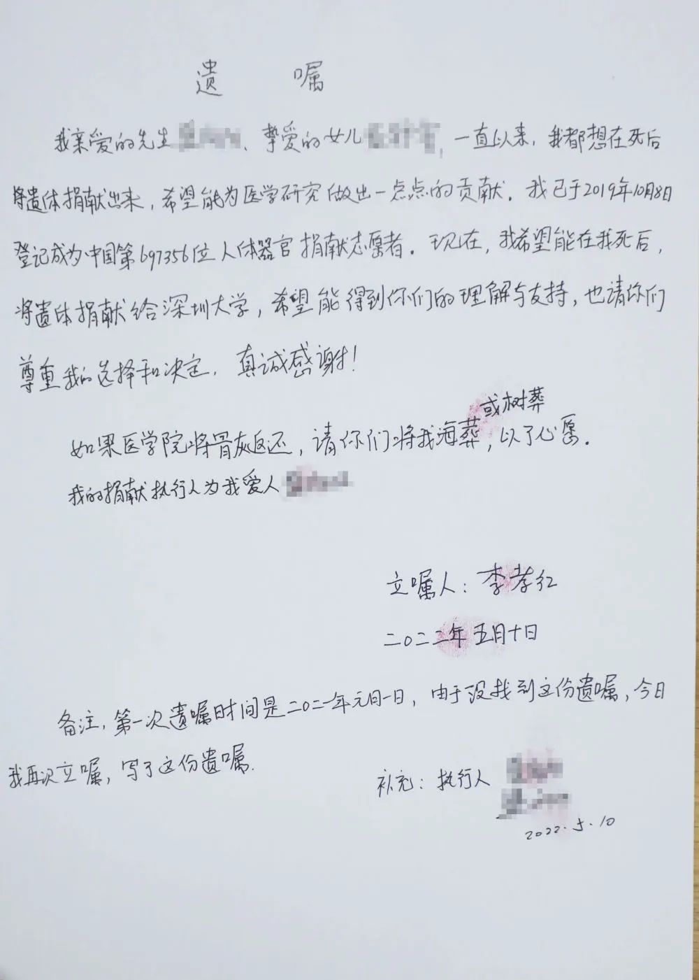 在深圳大学医学部缅怀厅,家人及工作人员向李孝红遗体告别。