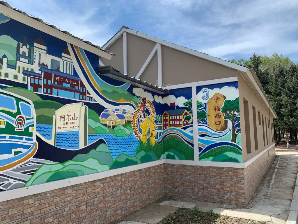 在西口村党群服务中心,几十面墙壁满是各色墙绘,艳丽而灵动,灰头土脸的老房子一下“活”了起来。这些作品都是近几年创作的。尤其在2021年,西口村举行了第一届阿尔山市乡村墙绘艺术大赛,上海大学上海美术学院、浙江艺术职业学院、广州美术学院附中等8所院校,近千人次来到西口村,长达数月进行墙绘创作,总创作面积超1000平方米。