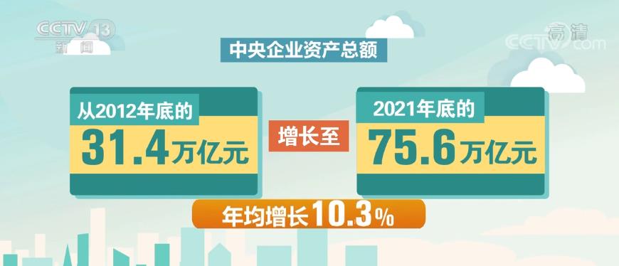 十年来,国有企业高质量发展迈出实质性步伐。中央企业资产总额从2012年底的31.4万亿元增长至2021年底的75.6万亿元,年均增长10.3%。中央企业利润总额从1.3万亿元增长至2.4万亿元,年均增长7.5%。先后有26组47家中央企业按市场化原则实施重组整合,中央企业数量从117家调整至97家。国有经济布局进一步优化。