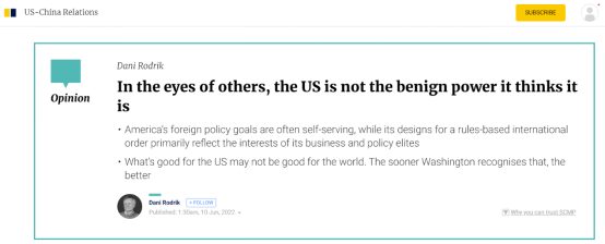 【环球网报道 记者 王艺璇】6月10日,香港《南华早报》刊发哈佛大学肯尼迪政府学院国际政治经济学教授丹尼 罗德里克、题为“在别人眼里,美国并不是它所认为的那种善意的力量(In the eyes of others, the US is not the benign power it thinks it is)”的评论文章。文章称,美国外交政策的目标往往是自私的,其对“开放市场”和“基于规则的国际秩序”的设计,通常主要反映的是美国商业和政治精英的利益,而不是小国的愿望。