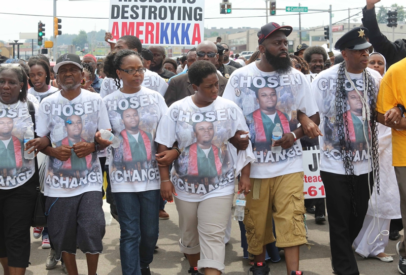 ↑2015年8月9日,在美国密苏里州圣路易斯郊区弗格森,迈克尔·布朗的父亲(右二)与其他几名抗议者手牵手走在游行队伍前列。来自全美各地的抗议人士9日聚集在美国密苏里州圣路易斯县弗格森市举行游行集会,纪念18岁黑人青年迈克尔·布朗被枪杀一周年。2014年8月9日,弗格森市18岁黑人青年布朗在没有携带武器的情况下,遭白人警察威尔逊拦截搜查并被开枪打死。