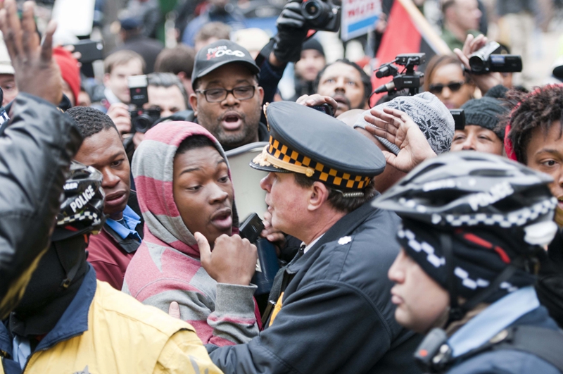 ↑2015年12月24日,抗议者在美国芝加哥举行的“黑色圣诞节”游行中与警方发生冲突。数百名抗议者当日走上美国芝加哥街头,抗议白人警察贾森·范戴克枪杀17岁黑人青年拉宽·麦克唐纳,呼吁民众关注警察执法不公现象,要求市长伊曼纽尔辞职。