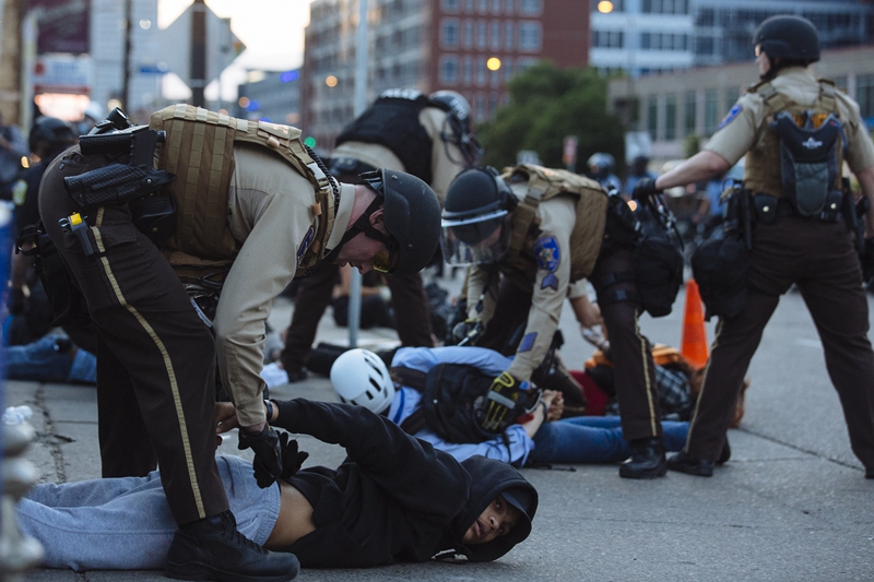 ↑2014年11月28日,在美国密苏里州弗格森警察局前,警察逮捕示威者。当晚,约100多名示威者阻断了弗格森警察局前的交通,抗议弗格森镇枪杀黑人青年迈克尔·布朗的白人警官达伦·威尔逊被免于起诉。警方随后逮捕了15名阻断交通的示威者。