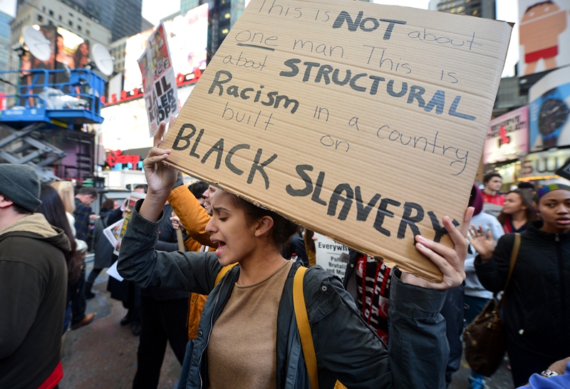 ↑2014年12月1日,在美国纽约,抗议者在纽约时报广场游行抗议弗格森事件。当日,数百名抗议者在纽约市参加游行和集会,抗议美国弗格森镇枪杀黑人青年迈克尔·布朗的白人警官达伦·威尔逊被免于起诉。
