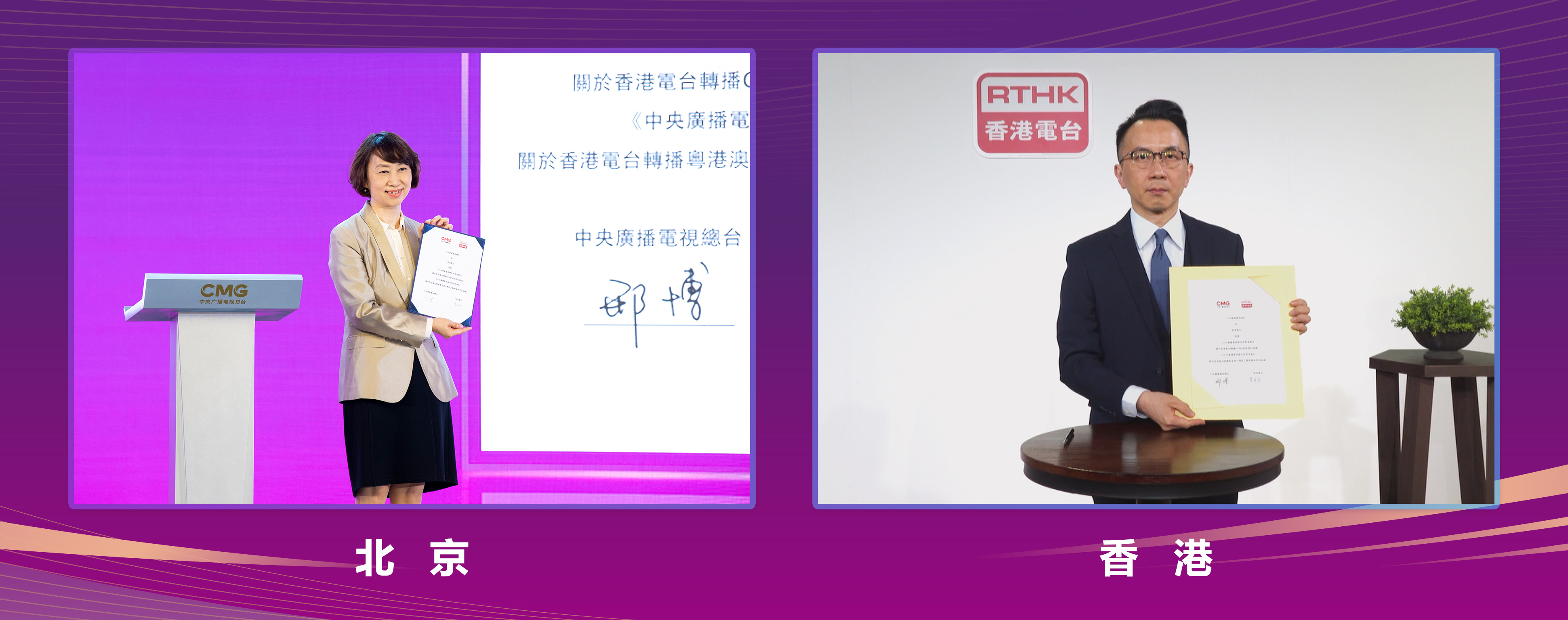 发布仪式上,中央广播电视总台编务会议成员邢博与香港电台台长李百全通过云签约的方式,代表双方达成协议,正式授权香港电台通过数字地面电视平台转播中央广播电视总台CGTN纪录频道,通过调频频率FM102.8播出粤港澳大湾区之声,于7月1日整频道整频率落地香港播出。与此前落地香港的总台央视综合频道(CCTV-1)、中文国际频道(CCTV-4)、戏曲频道(CCTV-11)、新闻频道(CCTV-13)、CGTN英语新闻频道等一起,为香港同胞提供更多喜闻乐见的视听节目。