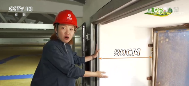 这堵墙的厚度有80厘米,这么厚实的一堵墙,是因为我脚下这6米高的小麦压力太大,第二是因为要确保粮食储存在一个低温、低湿、低氧的环境下。