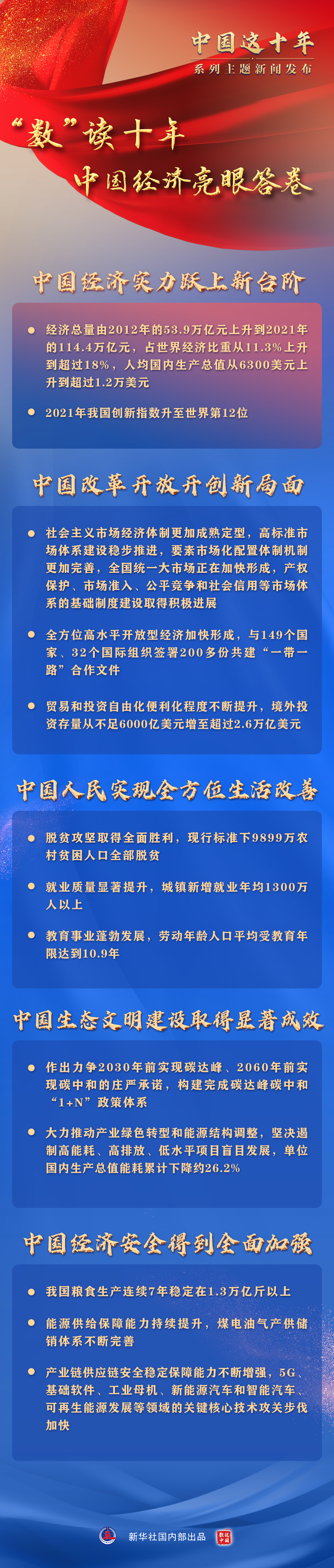 “回顾党的十八大以来经济社会发展的光辉历程,在习近平经济思想的指引下,我国正在加快迈向更高质量、更有效率、更加公平、更可持续、更为安全的发展之路,我国的经济实力、科技实力、综合国力、国际影响力持续增强,我们以实际行动交出了一份人民满意、举世瞩目、可以载入史册的中国答卷。”