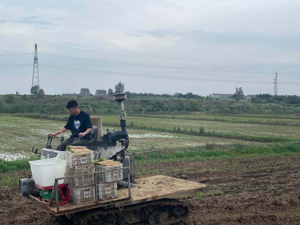 6月15日,在安徽省滁州市天长市汊涧镇张营村,天长市禾禾生态农业专业合作社农机服务人员正在为土地托管户运送秧苗。(新华社发)