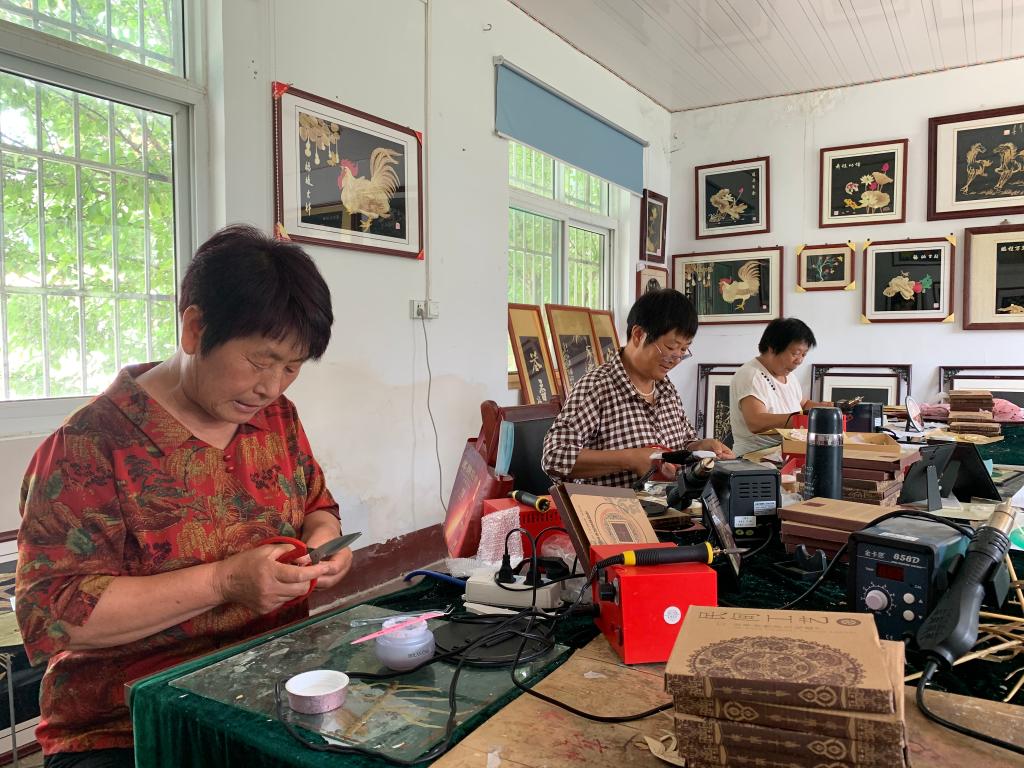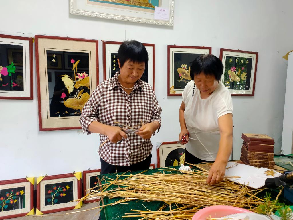 “学个手艺,不收学费,还给工钱。”60岁的村民曲广芹从去年起跟随李志海学习麦秆画,如今已能根据图样自己创作牡丹、雄鹰等作品。“农闲时在这里剪秸秆、贴个画,一天能挣50多元,心情甭提多好啦。”