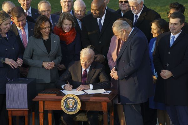 2021年11月15日,美国总统拜登(中)在白宫签署总额约1万亿美元的跨党派基础设施投资法案。经济学家认为,此项法案不足以填补美国巨大的基础设施融资缺口,对经济增长的拉动作用有限。