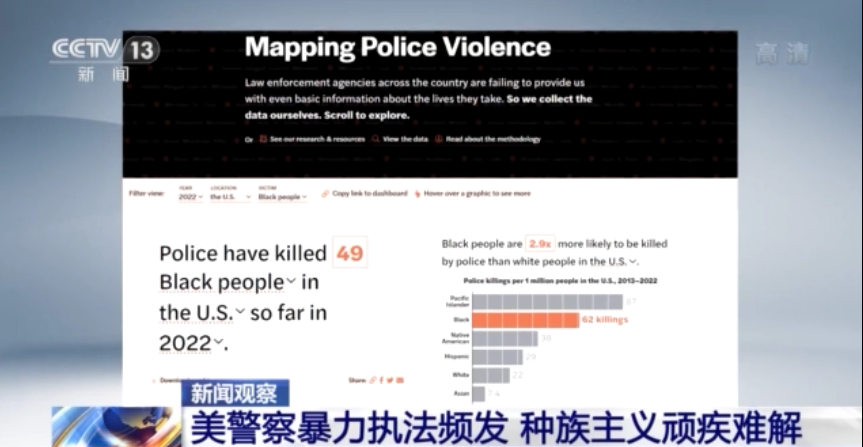 根据“警察暴力地图”网站统计的数据,2020年至今美国警察执法致死人数已达到2563人,其中非洲裔死亡人数达到565人,占比超过22%。仅今年以来,就有49名非洲裔被警方开枪打死。网站还显示,在美国,非洲裔被警察执法致死的可能性是白人的2.9倍。