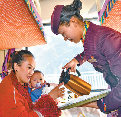 青藏铁路延长线拉日铁路Z8801次列车上,乘务员在为乘客倒水。