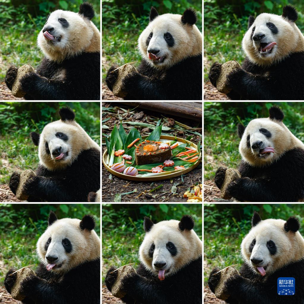 7月4日,在成都大熊猫繁育研究基地幼年大熊猫别墅,大熊猫“和叶”捧着特制的生日蛋糕享用,中间为基地特制的生日蛋糕(拼版图片)。