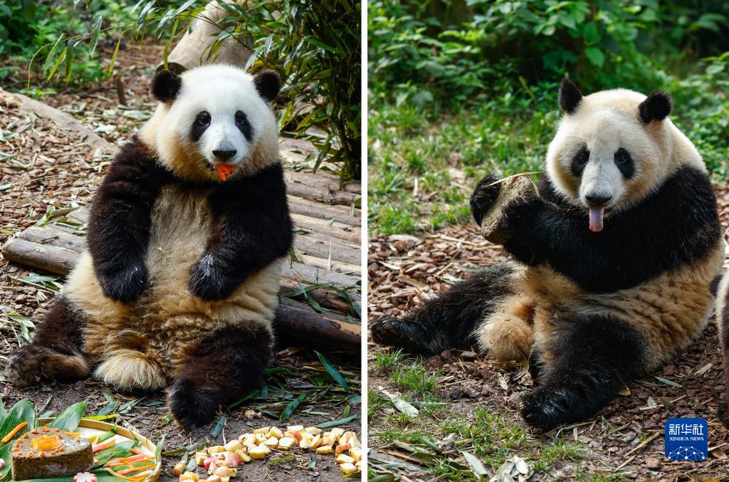 7月4日,在成都大熊猫繁育研究基地幼年大熊猫别墅,大熊猫“和花”(左)与“和叶”在享用特制的生日蛋糕(拼版图片)。