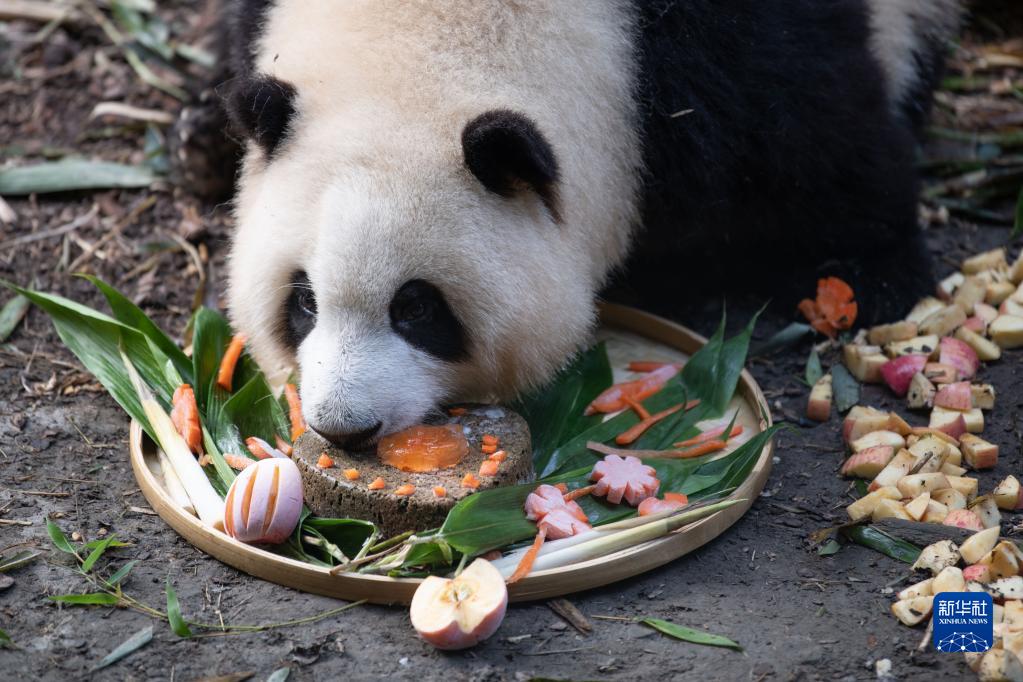 7月4日,在成都大熊猫繁育研究基地幼年大熊猫别墅,大熊猫“和花”坐在特制的生日蛋糕及苹果前,准备享用美食。