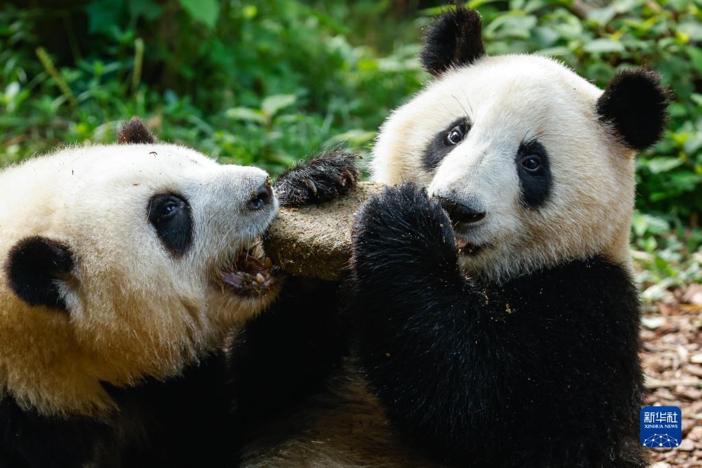 7月4日,在成都大熊猫繁育研究基地幼年大熊猫别墅,大熊猫“和花”(左)与“和叶”在一起嬉戏。