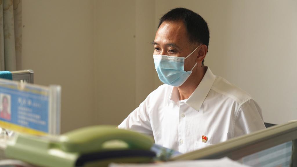 6月27日,瑞丽市勐卯街道兴安社区党总支书记周全国在工作。新华社记者林碧锋摄