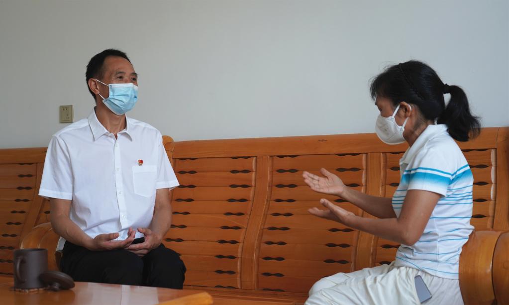6月27日,周全国(左)在居民张绍银家中入户走访。新华社记者林碧锋摄