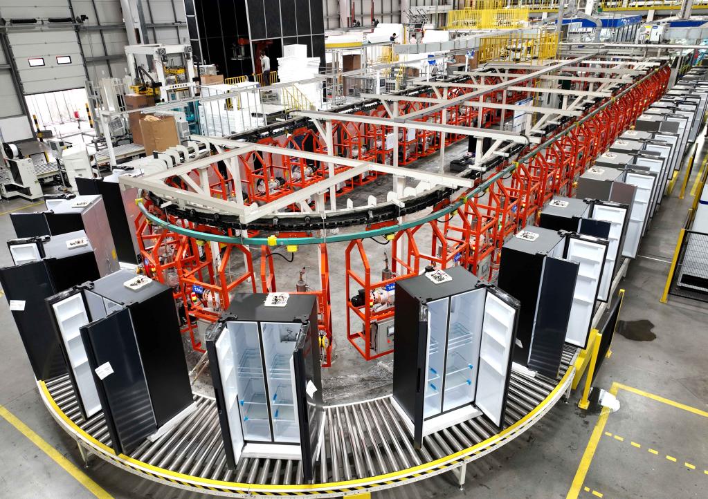 5月12日,在安徽合肥经济技术开发区,合肥海尔电冰箱有限公司的冰箱生产线有序生产。新华社发(解琛摄)