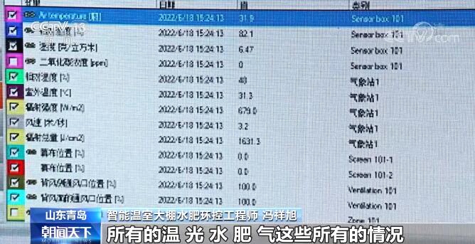 这套种植管控系统就是大棚的“智慧大脑”。棚里有846个传感器,它们每时每刻紧盯作物生长情况,土壤pH值、墒情等数据都会实时监测并传回到电脑里,什么时候浇水,什么时候施肥,电脑都会给出判断和指令。