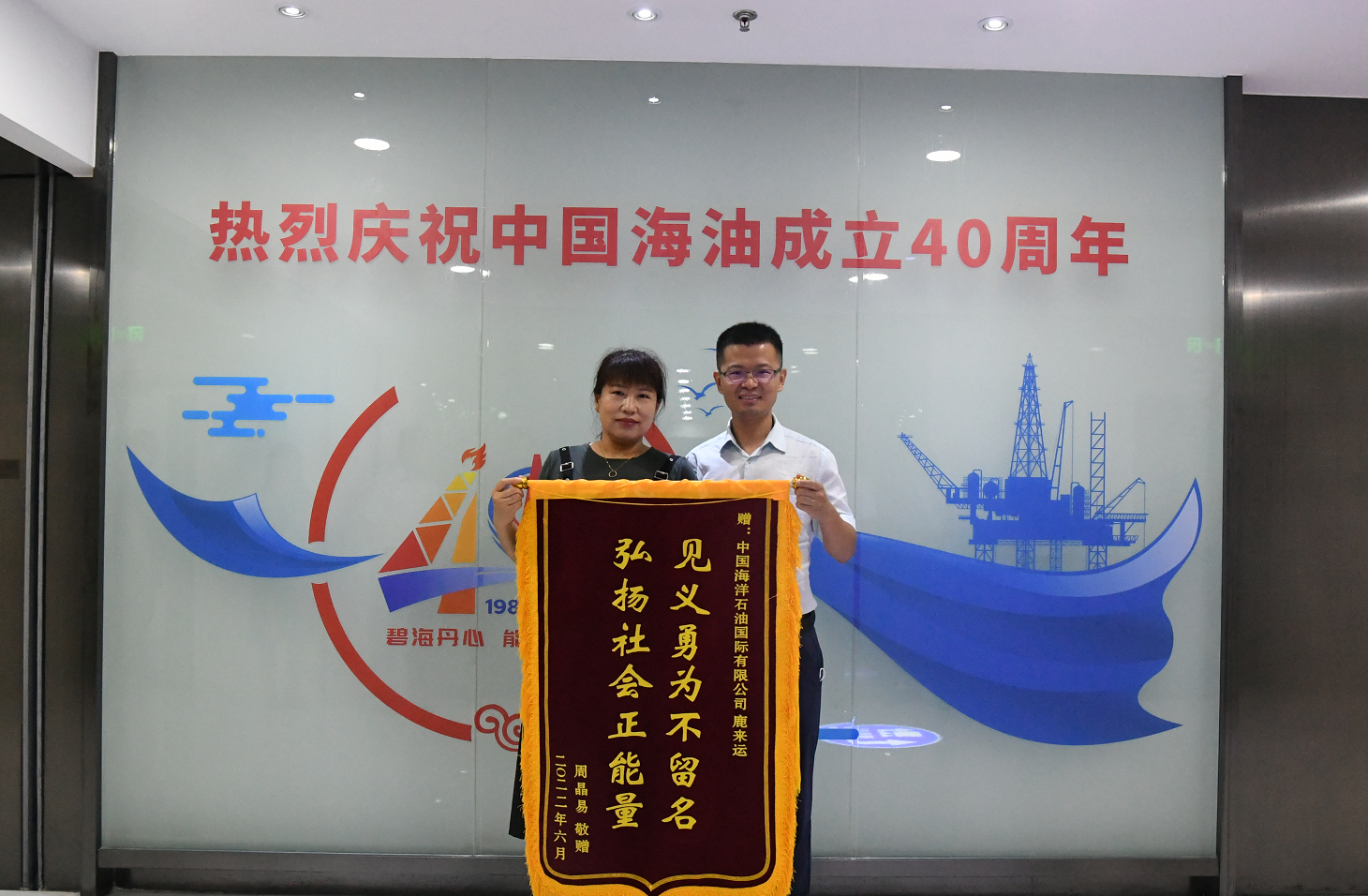 7月4日一早,位于朝阳区芍药居的中国海洋石油国际有限公司迎来一位特殊“客人”。市民周晶易女士拿着一面写有“见义勇为不留名,弘扬社会正能量”的锦旗前来,想要当面感谢她的救命恩人——中国海油员工鹿来运。