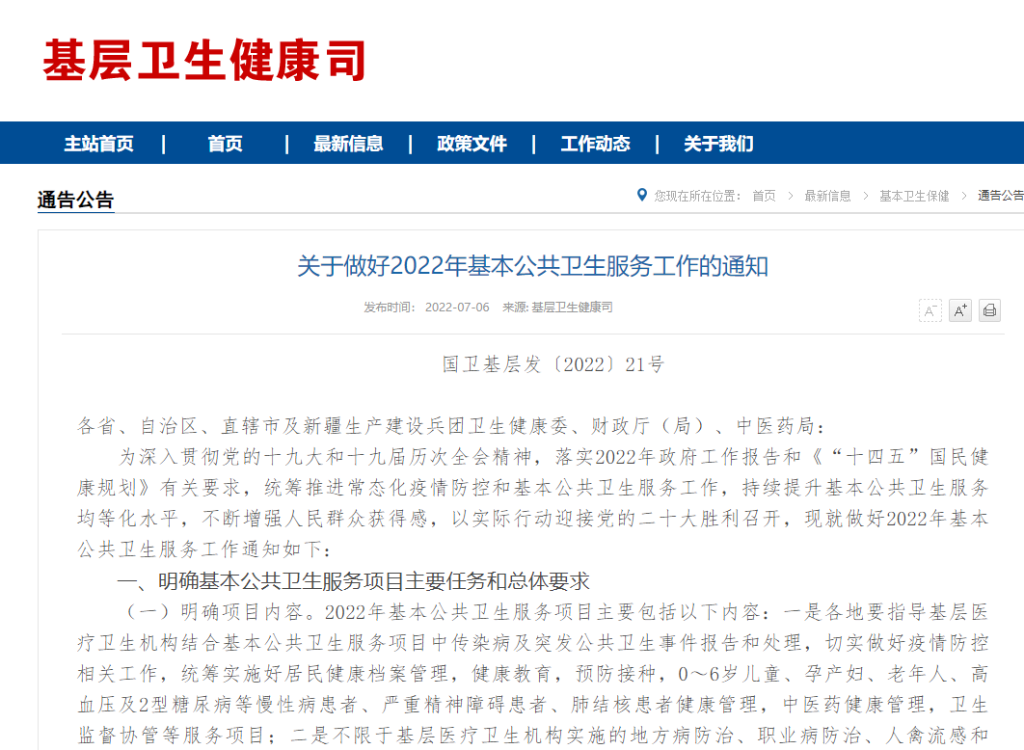 通知明确,2022年基本公共卫生服务项目主要包括切实做好疫情防控相关工作,统筹实施好居民健康档案管理,健康教育,预防接种,0-6岁儿童、孕产妇、老年人、高血压及2型糖尿病等慢性病患者、严重精神障碍患者、肺结核患者健康管理,中医药健康管理,卫生监督协管等服务项目;不限于基层医疗卫生机构实施的地方病防治、职业病防治、人禽流感和SARS防控、鼠疫防治、国家卫生应急队伍运维保障、农村妇女“两癌”检查、脱贫地区儿童营养改善、老年健康与医养结合服务等16项服务内容,确保服务对象及时获得相应的基本公共卫生服务。