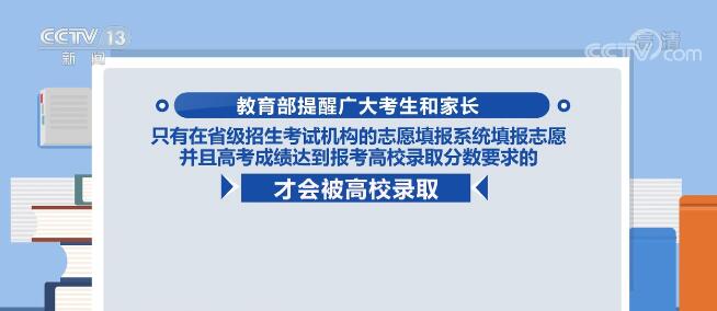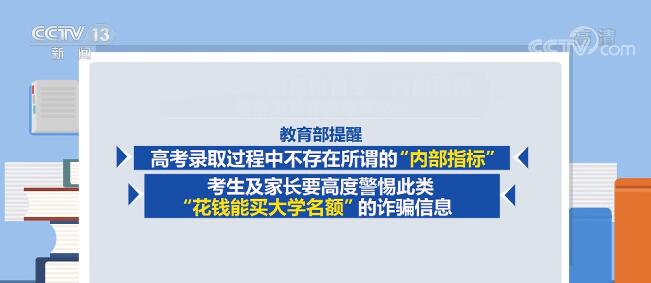 教育部提醒广大考生和家长,只有在省级招生考试机构的志愿填报系统填报志愿并且高考成绩达到报考高校录取分数要求的,才会被高校录取。教育部提醒,高考录取过程中不存在所谓的“内部指标”,考生及家长要高度警惕此类“花钱能买大学名额”的诈骗信息。
