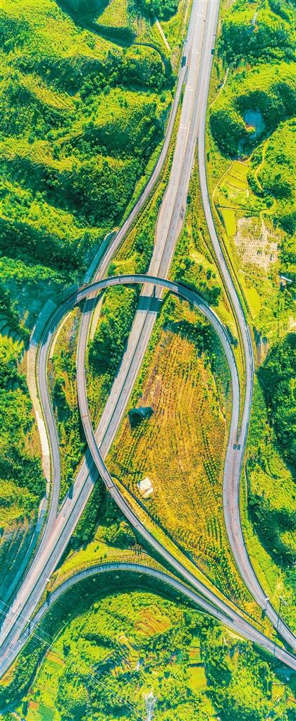 俯瞰太行山高速和沧榆高速在阜平境内互通交汇处。便捷的交通网络促进了阜平经济快速发展。