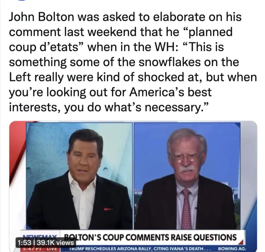 如今博尔顿的表态可谓直白,说起策划政变时毫无遮掩。显然,“策划政变”对这名美国知名鹰派人物来说已经是轻车熟路。