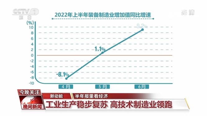 数据显示,上半年规模以上工业增加值同比增速从5月份企稳回升,6月明显反弹,升至3.9%。其中,高技术制造业领跑明显,恢复较快,带动作用进一步增强。1—6月份,高技术制造业增加值同比增长9.6%,高于制造业增速6.8个百分点。装备制造业同样呈现明显回升态势,5月份装备制造业增加值同比增速为1.1%,一下子回升9.2个百分点,6月份同比增长9.2%,比上月加快了8.1个百分点。