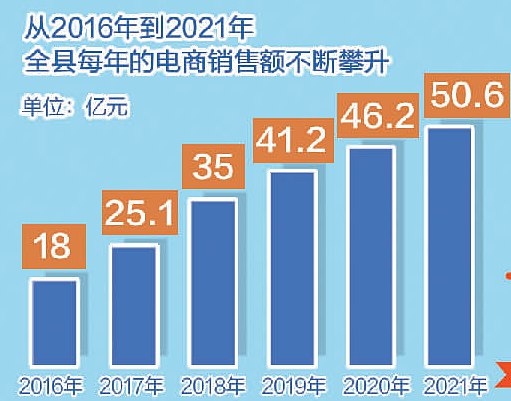 “大进大出、快进快出”模式,帮助武功电商快速抢占地盘,站到了新台阶上。18亿元、25.1亿元、35亿元、41.2亿元、46.2亿元、50.6亿元,从2016年到2021年,武功县每年的电商销售额不断攀升。