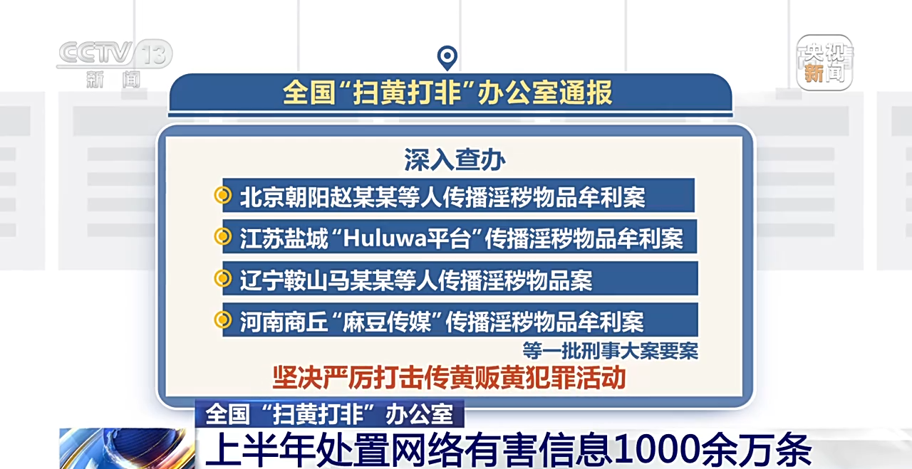 “扫黄打非”案件查办工作成效明显。各地“扫黄打非”部门对一批知名互联网平台登载法律法规禁止性内容等行为作出了行政处罚,督促压实企业主体责任。同时,对违法违规账号进行处置。坚持端窝点、打团伙、断链条,深入查办北京朝阳赵某某等人传播淫秽物品牟利案、江苏盐城“Huluwa平台”传播淫秽物品牟利案、辽宁鞍山马某某等人传播淫秽物品案、河南商丘“麻豆传媒”传播淫秽物品牟利案等一批刑事大案要案,坚决严厉打击传黄贩黄犯罪活动。
