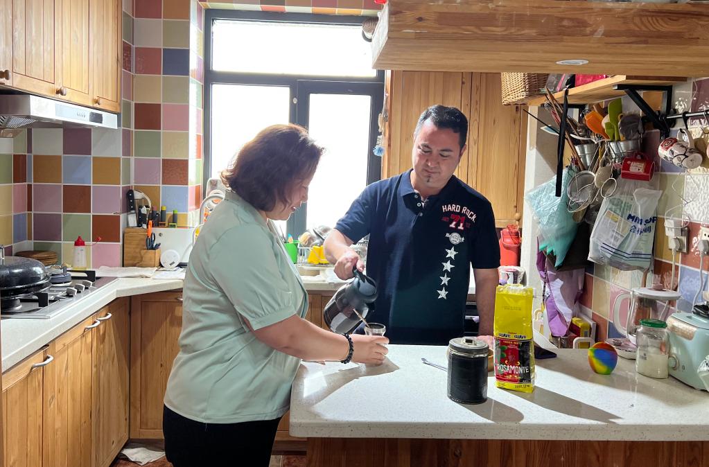 克里斯蒂安·阿卡尔在位于辽宁省大连市甘井子区的家中和妻子一起准备阿根廷下午茶。新华社记者 赵洪南 摄