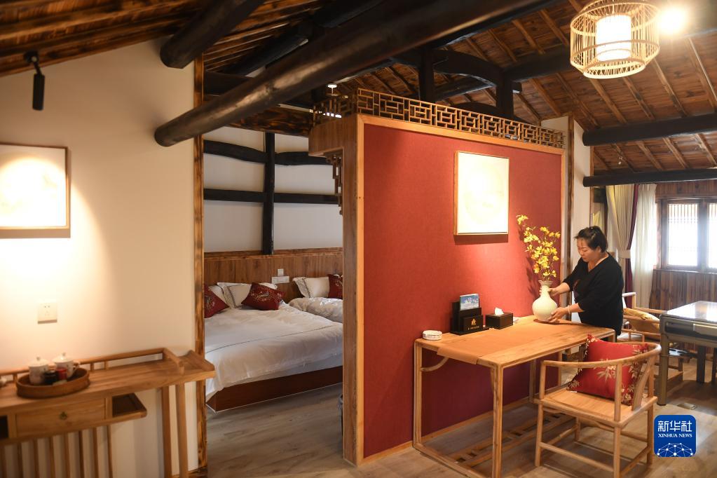 服务员在浙江省磐安县乌石村一家民宿内整理房间(2019年4月24日摄)。新华社记者 翁忻旸 摄