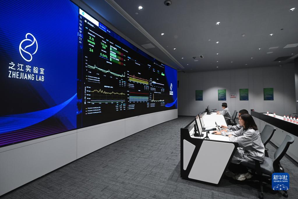 在之江实验室计算与数据中心,工程师们通过“之江云”系统监测服务器集群的运行状态(2022年6月23日摄)。新华社记者 黄宗治 摄