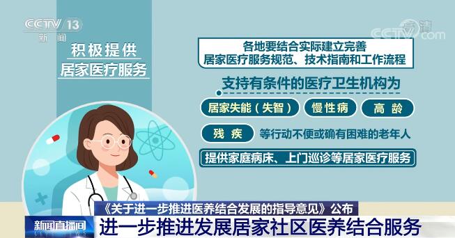 《意见》指出,积极提供居家医疗服务。各地要结合实际建立完善居家医疗服务规范、技术指南和工作流程,支持有条件的医疗卫生机构为居家失能(失智)、慢性病、高龄、残疾等行动不便或确有困难的老年人提供家庭病床、上门巡诊等居家医疗服务。推进“互联网+医疗健康”“互联网+护理服务”,创新方式为有需求的老年人提供便利的居家医疗服务。