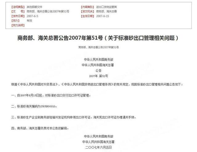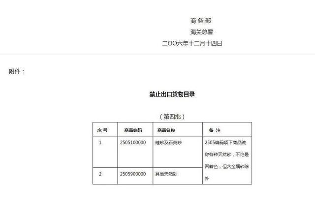 目前品目25.05项下天然砂出口均实行c管理措施,如下两个公告: