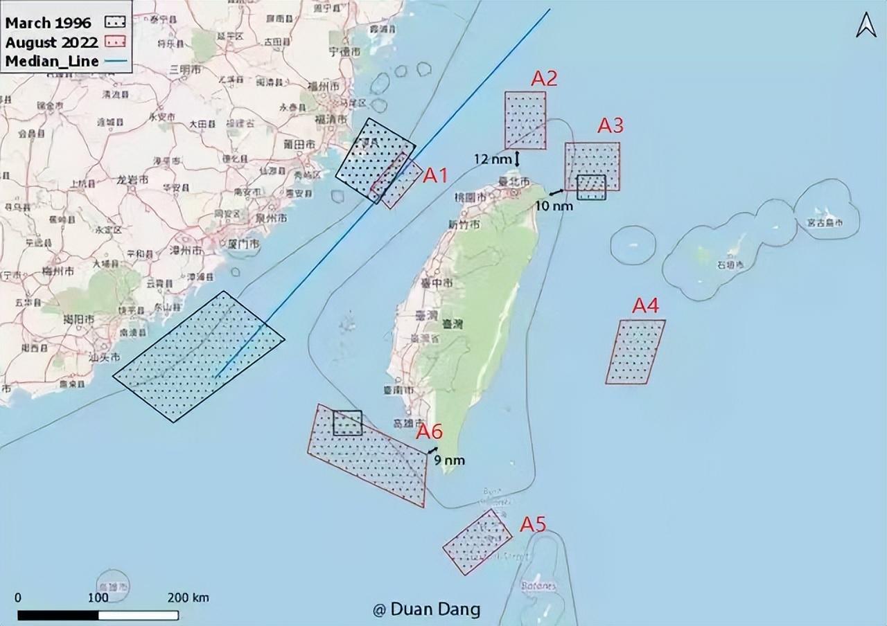 第七,相对于1996台海危机的演习区域,我们的演习更加靠近台湾本土,并且演习区域的密度也大大增加。1996年的演习对台湾东部并没有实施封锁和威慑,而这次演习我们补上了这块缺口,并且在台北和高雄,这两个台湾最重要的城市海岸边,都突破了12海里所谓的“领海基线”。