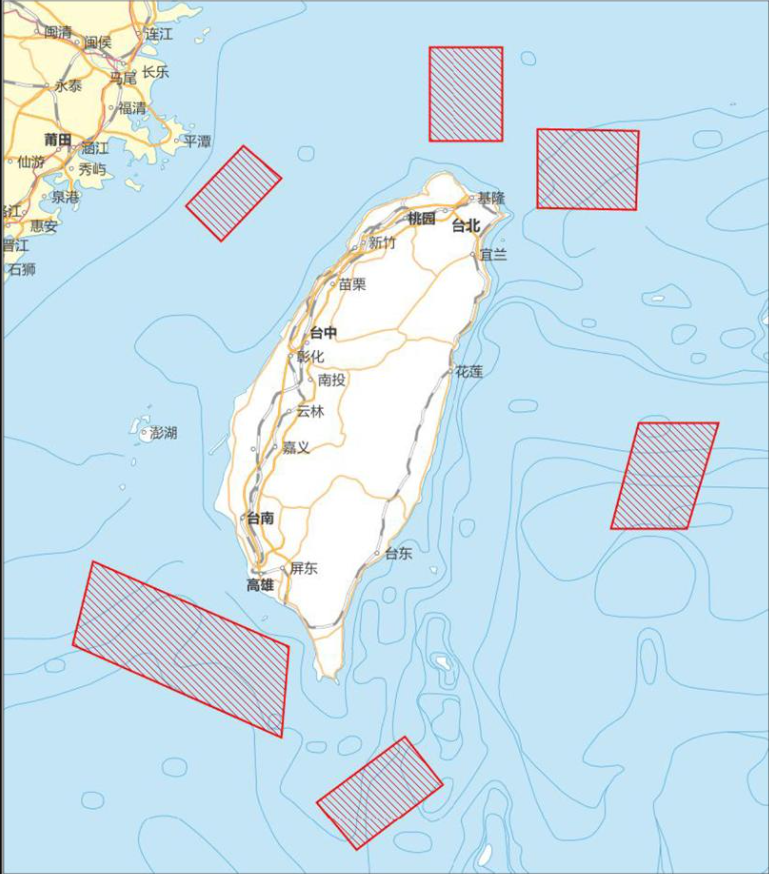 中国人民解放军将于北京时间2022年8月4日12时至7日12时,在以上海域和空域,进行重要军事演训行动,并组织实弹射击。图自新华社