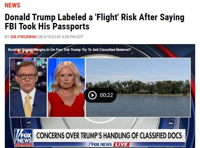 律师赛斯·艾布拉姆森(Seth Abramson)发文写道,如果这一消息是真的,“美国联邦调查局(FBI)正在承认我长期以来所说的……特朗普有潜逃风险。”