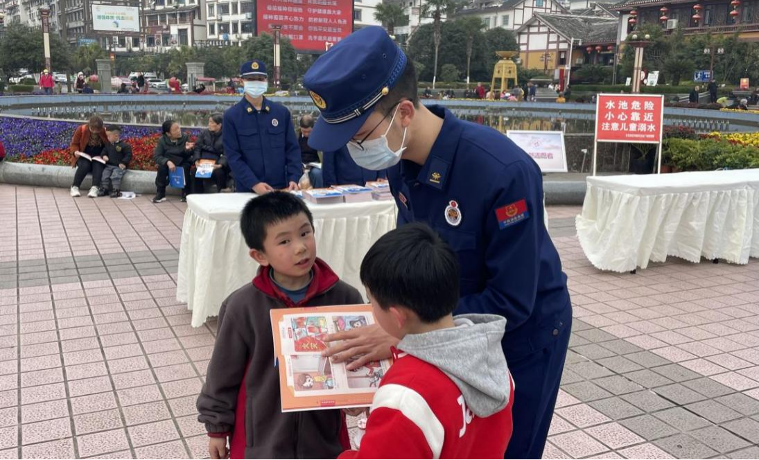 贵州省遵义市红花岗区会址消防救援站战斗二班副班长安峻男正在向小朋友宣讲防火知识。本人供图