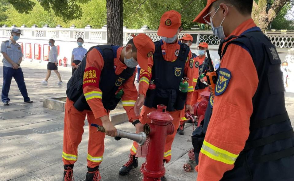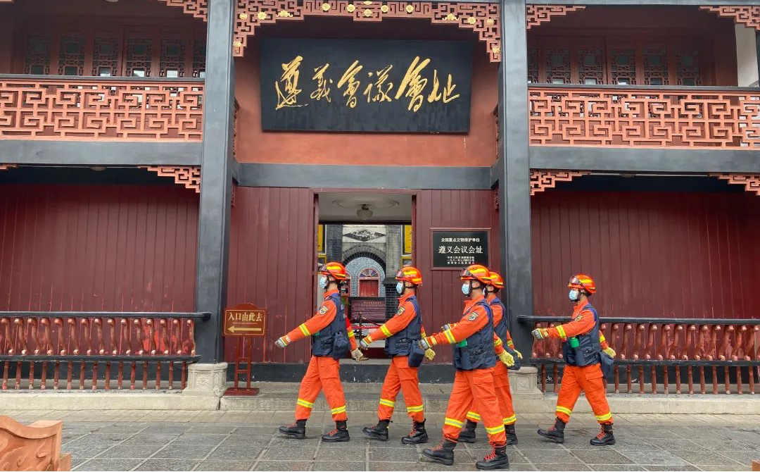 临近闭馆,不少游客仍在会址外流连忘返,他们举起手机,争分夺秒与“珍贵历史”来一张合影,贵州省遵义市红花岗区会址消防救援站战斗二班副班长安峻男却一刻不得闲。这天,正是他当值“红旗巡逻队”队长。他与战友身着救援服,背上50余斤的细水雾,开始对会址景区内部及周边进行巡逻检查。