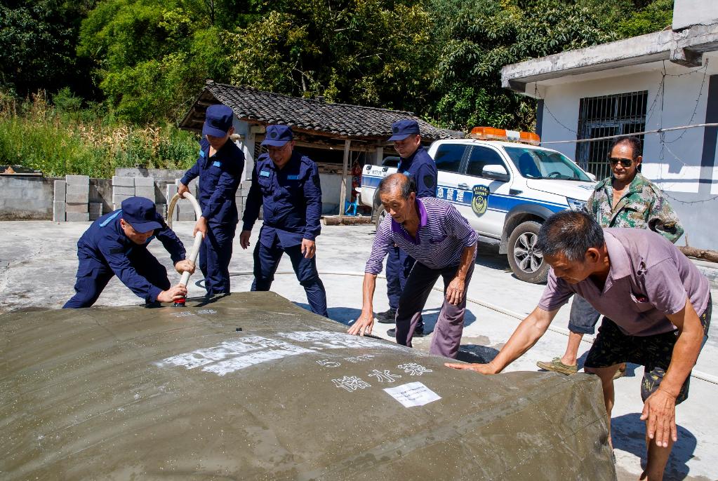 重庆南川区综合应急救援队调配储水袋进村送水。甘昊旻 摄