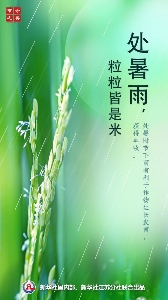 江苏省农业科学院农业资源与环境研究所研究员宁运旺介绍,处暑后,我国大部分地区林果和农作物陆续进入成熟期。农民们会抢抓农时,进行水稻施肥、除草等田间管理。这一时节,秋熟作物多处于籽粒开始形成或充实时期,水稻一般处于孕穗期,对水分需求很大。此时下雨有利于作物生长发育、获得丰收,因此有“处暑三朝稻有孕”“处暑雨,粒粒皆是米”等农谚。