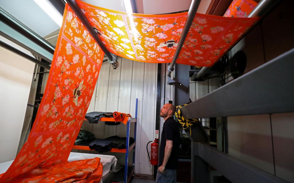 8月11日,工人在英国麦克尔斯菲尔德一家丝绸工厂内工作。新华社记者李颖摄